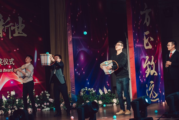 表演間隙,由東方集團(tuán)員工和開發(fā)區(qū)幼兒園老師們合作的互動(dòng)節(jié)目《團(tuán)結(jié)互助》和《集體拋繡球》以其新穎獨(dú)特的形式、幽默風(fēng)趣的互動(dòng),再一次活躍了臺(tái)上臺(tái)下的氣氛。