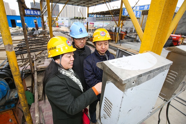 圖為區(qū)建設(shè)工程安全監(jiān)督站工作人員檢查北師大附屬學(xué)校工程臨時(shí)用電情況