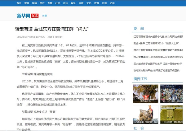 9月30日,新華網(wǎng)江蘇頻道在首頁(yè)以《轉(zhuǎn)型有道:鹽城東方在黃浦江畔“閃光”》http://www.js.xinhuanet.com/2017-09/30/c_1121750855.htm?from=timeline&isappinstalled=0 為題,從戰(zhàn)略轉(zhuǎn)型緣自智慧的決策、引擎轉(zhuǎn)型找準(zhǔn)支點(diǎn)巧“登高”、全面轉(zhuǎn)型受益政府“扶上馬,送一程”等三個(gè)方面濃情點(diǎn)贊了東方集團(tuán)走進(jìn)上海、轉(zhuǎn)型發(fā)展的驕人業(yè)績(jī)。