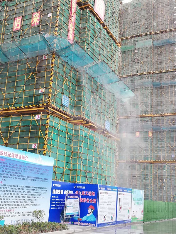 揚塵是施工過程中的常見問題。在該工地內(nèi),環(huán)境監(jiān)測系統(tǒng)和高壓噴淋設(shè)備這兩件“神器”有效抑制了揚塵污染?,F(xiàn)場看到,環(huán)境監(jiān)測系統(tǒng)隨時監(jiān)控PM2.5、PM10、噪聲、溫度等數(shù)值,工地的各建筑樓體在第四層腳手架外圍每隔3米安裝一個高壓噴淋設(shè)備,項目出入口處采用霧炮機進行揚塵控制,確保噴淋范圍能夠全覆蓋。當(dāng)揚塵監(jiān)測系統(tǒng)濃度達到警戒值時,高壓噴淋設(shè)備便會噴射出細密的水霧,霧炮機則針對不同施工區(qū)域適時調(diào)整方向,噴射高壓水霧,確保施工現(xiàn)場不起揚塵。