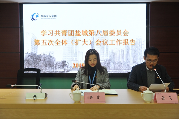 為及時(shí)傳達(dá)學(xué)習(xí)貫徹市委八屆五次全體(擴(kuò)大)會(huì)議精神, 2月15日上午,鹽城東方集團(tuán)團(tuán)委在1012會(huì)議室召開會(huì)議,專題傳達(dá)學(xué)習(xí)市委八屆五次全體(擴(kuò)大)會(huì)議精神,團(tuán)委書記吳霞主持會(huì)議并講話,團(tuán)委副書記任飛、全體委員、青年員工40余人參加會(huì)議。