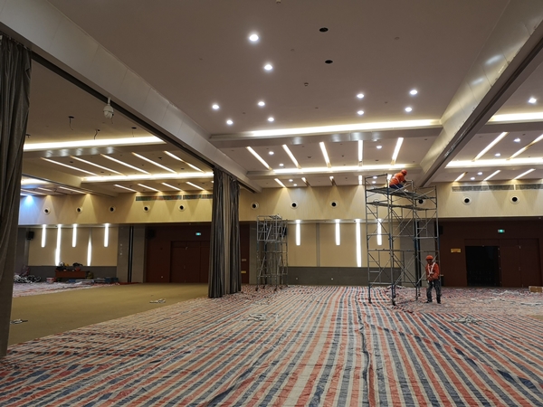 截至假期結束,項目現(xiàn)場三塊LED屏主體框架已基本完成,項目效果初現(xiàn);二樓會議大廳已完成頂部噴淋改造,舞臺燈具槽、吊頂及會場燈具正在安裝施工中,整體工程力保5月15日前順利交付使用。