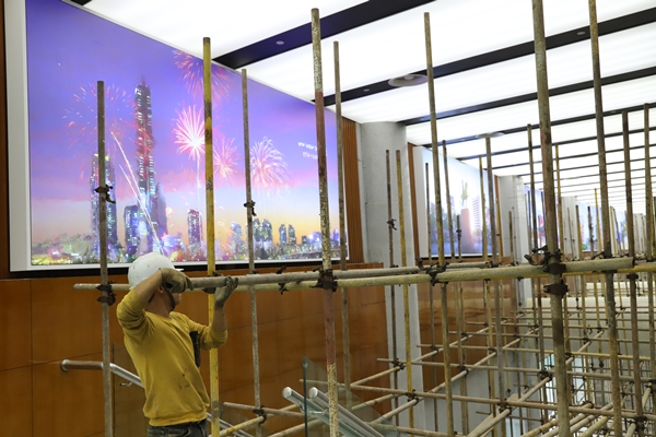 場館提升改造過程中,項目管理人員與現(xiàn)場50多名工人日夜忙碌、并肩作戰(zhàn),開足馬力推進會議中心燈光亮化和LED顯示屏安裝工程。一手搶抓工期,科學(xué)制定施工方案,對施工單位明確獎懲條款,在充分利用時間的同時合理套搭施工,提高施工效率;一手與施工單位簽訂安全生產(chǎn)責(zé)任狀,定時定點巡查安全質(zhì)量隱患,確保安全“零事故”和質(zhì)量“高品質(zhì)”。截止目前,項目現(xiàn)場安裝完成3塊LED顯示屏,二樓會議大廳頂部噴淋改造,舞臺燈具槽、吊頂及會場燈具安裝均已完成,中心休息區(qū)及貴賓室升級等工程已順利完工。為做好全館保潔、室外的環(huán)境衛(wèi)生等工作,東方物業(yè)自4月30日接到通知后,即刻行動,清洗噴泉池及室外廣場,修理噴水泵及廣場石材等,并配合做好改造后的全館保潔、零星維修、現(xiàn)場安保、音響及大屏調(diào)試等工作。