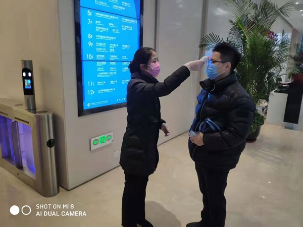 “您好,請(qǐng)留步,先測(cè)量下體溫,才可以進(jìn)入公司……”2月26日上午8點(diǎn)15分,鹽城東方集團(tuán)物業(yè)安保人員嚴(yán)格按照防疫工作要求,對(duì)上班的員工進(jìn)行體溫測(cè)量。自企業(yè)復(fù)工后,該集團(tuán)及時(shí)掌握復(fù)工人員動(dòng)態(tài),全力做好疫情防控期間企業(yè)有序復(fù)產(chǎn)復(fù)工工作。