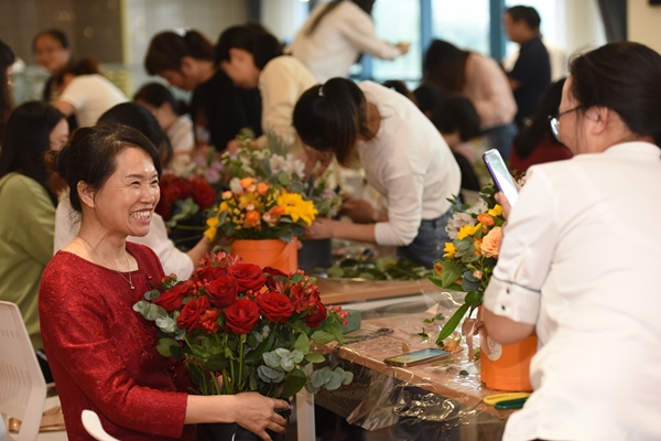 在花藝?yán)蠋煹闹v解和指導(dǎo)下,女職工們熱情高漲,發(fā)揮對美的想象和創(chuàng)意,全身心地投入作品創(chuàng)作中。將花卉精心地修剪、整枝,經(jīng)過系列藝術(shù)加工,一朵朵鮮花、一片片綠枝,在一雙雙巧手的擺弄中錯(cuò)落有致地插在一起,花藝課堂彌漫著淡淡的香氣,一盆盆燦爛繽紛、溫馨秀美的花藝作品“新鮮出爐”,大家手捧著自己的得意之作,臉上洋溢著喜悅之情。