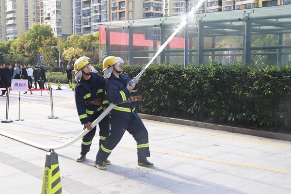 15:20分,隨著一聲清脆的哨聲響起,只見集團微型消防站的2位消防隊員,迅速穿好消防滅火服后,隨即將兩條消防水帶進行對接,一支水柱迅速騰空而起,專業(yè)的操作、規(guī)范的動作,將日常訓(xùn)練的消防技能水平發(fā)揮得淋漓盡致,嫻熟的消防技能展示贏得現(xiàn)場觀眾的陣陣喝彩。