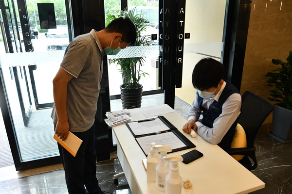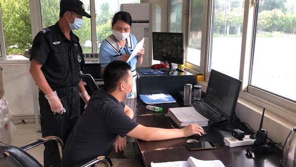 集團(tuán)資產(chǎn)部工作人員詳細(xì)檢查登記韓資園疫情防控落實(shí)情況。