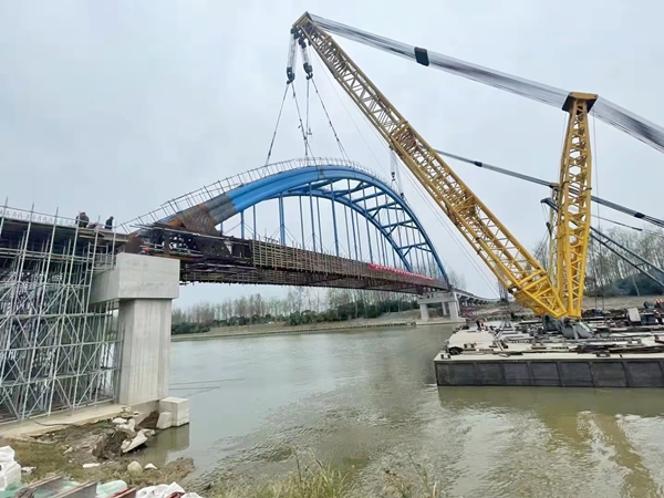 10月20日13時(shí)20分,在鹽城經(jīng)開(kāi)區(qū)德喜大橋施工現(xiàn)場(chǎng),跨徑97米、重480噸的勁性骨架系桿拱在兩艘大型浮吊船的聯(lián)合起吊下,平穩(wěn)安裝至主墩位置,完成主橋上部結(jié)構(gòu)整體吊裝,標(biāo)志著德喜大橋順利完成合龍,項(xiàng)目施工進(jìn)入新的階段。
