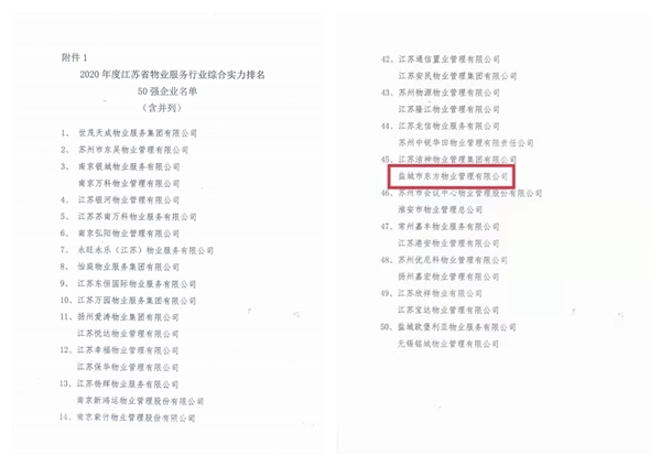 日前,江蘇省房地產(chǎn)業(yè)協(xié)會發(fā)布“2020年度江蘇省物業(yè)服務(wù)行業(yè)綜合實(shí)力50強(qiáng)企業(yè)排名”名單,鹽城市東方物業(yè)管理有限公司榜上有名。