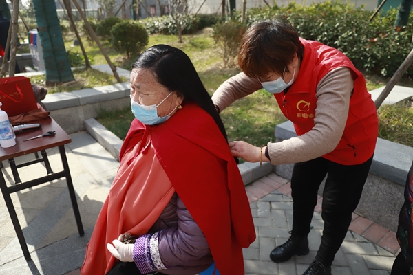 在志愿者們的引導(dǎo)下,居民們佩戴口罩,有序在一米線外等待。在“免費(fèi)理發(fā)”點(diǎn)位,志愿者們熱情接待前來(lái)理發(fā)的每一位居民,并針對(duì)老年人、中年朋友分別設(shè)計(jì)不同的發(fā)型,手中銀剪上下翻飛,嫻熟精湛的技術(shù)讓居民精神面貌煥然一新,理發(fā)師傅一邊理發(fā)一邊與居民拉家常,增感情,現(xiàn)場(chǎng)氣氛溫馨活躍。