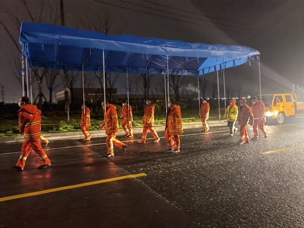 19日下午,根據(jù)區(qū)主要領(lǐng)導(dǎo)關(guān)于增設(shè)雨棚、監(jiān)控攝像頭、進出口隔離帶與值守集裝箱的整改意見,他們一著不讓、一刻不拖,在接近零下的低溫環(huán)境中,冒著瓢潑的凍雨和冰雹,繼續(xù)打足人手、上足機械、保足物資,又是一夜奮戰(zhàn),又是一場硬仗,直至全面完成。