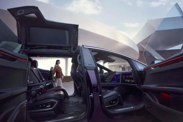 (HiPhi X獨創(chuàng)的高合展翼門能讓用戶更便捷地進出,垂直開啟的頂翼門、最大角度接近90度的對開門,為用戶提供極為寬敞的上下車空間)
