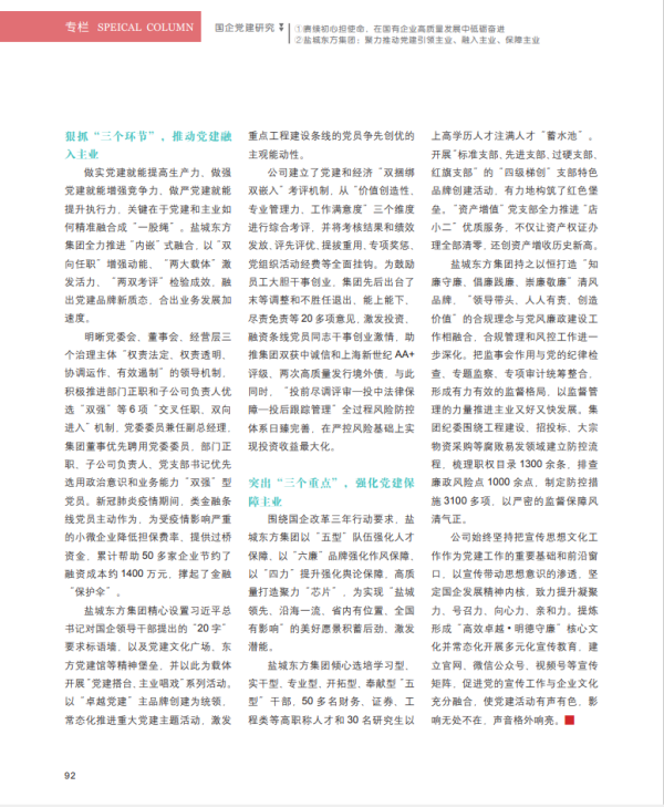 近日,《上海國資》雜志再次聚焦東方集團(tuán),通過在2023年第3期“國企黨建研究”專欄發(fā)表題為“鹽城東方集團(tuán):聚力推動(dòng)黨建引領(lǐng)主業(yè)、融入主業(yè)、保障主業(yè)”調(diào)研文章,深度報(bào)道了東方集團(tuán)通過大力實(shí)施黨建促主業(yè)“333”工程,推動(dòng)黨建工作與經(jīng)營發(fā)展深度融合,把黨建優(yōu)勢(shì)轉(zhuǎn)化為企業(yè)高質(zhì)量發(fā)展的制勝優(yōu)勢(shì),為奮力實(shí)現(xiàn)勇當(dāng)國企高質(zhì)量轉(zhuǎn)型發(fā)展標(biāo)桿目標(biāo)奠定了堅(jiān)實(shí)的基礎(chǔ)。