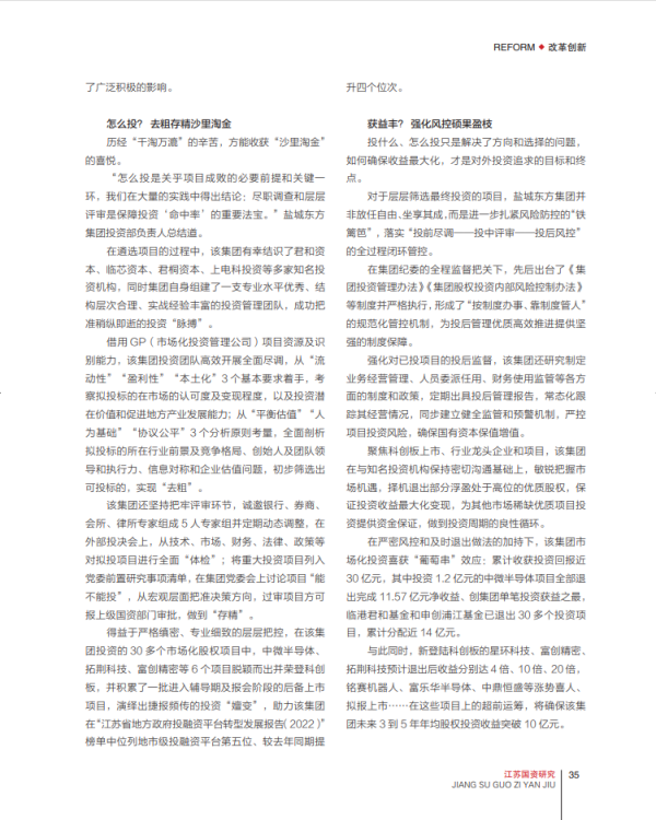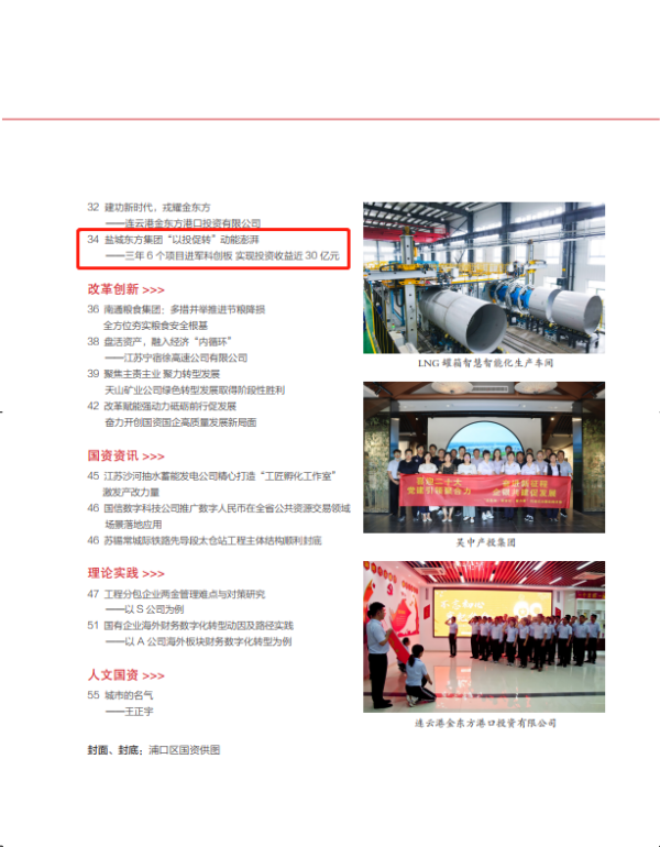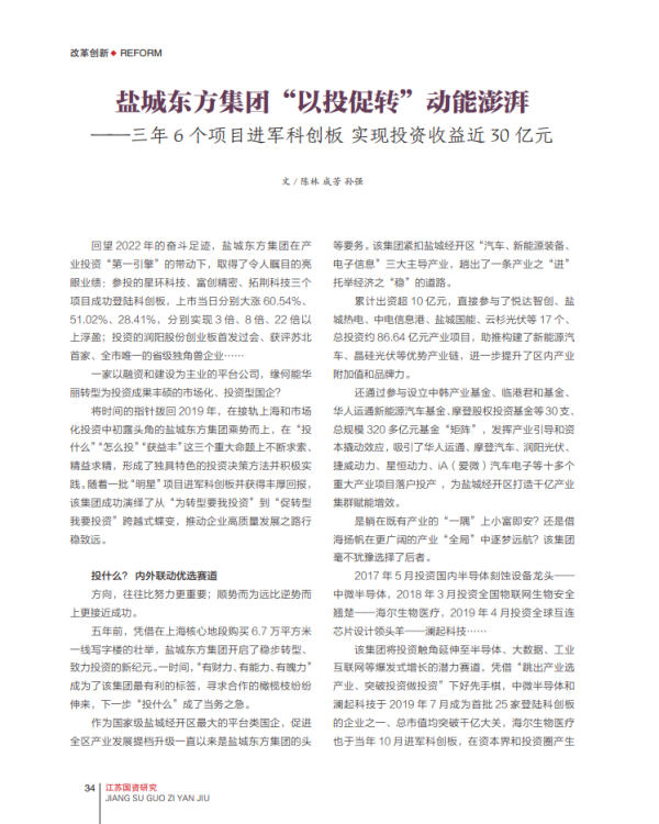 近日,《江蘇國資研究》雜志再次聚焦鹽城東方集團,通過在2023年4月第2期“高質發(fā)展”專欄發(fā)表題為“鹽城東方集團‘以投促轉’動能澎湃——三年6個項目進軍科創(chuàng)板 實現(xiàn)投資收益近30億元”調研文章,深度報道了該集團奮力實現(xiàn)從“為轉型要我投資”到“促轉型我要投資”的跨越式蝶變、全力爭當?shù)胤絿蟾哔|量轉型發(fā)展標桿的生動實踐。