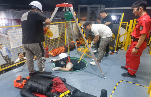 在安全生產(chǎn)實訓館,大家分別參觀了綜合用電、建筑施工、易燃易爆、有限空間、機械操作、廠區(qū)環(huán)境、新能源風險等7大危險作業(yè)環(huán)境。在建筑施工體驗區(qū),工程條線員工在穿戴好防護裝備后,進行了洞口墜落的親身體驗;在有限空間體驗區(qū),東欣、東方水務公司3名員工根據(jù)職責分工,按照流程進行警示隔離、持續(xù)通風、氣體檢測、佩戴正壓式呼吸器安全帶等防護裝備、安放三腳架、進入事故空間、救出遇險人員的全過程作業(yè)環(huán)境,順利完成救險任務。