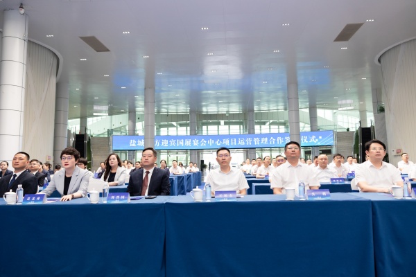 在雙方領(lǐng)導(dǎo)的見(jiàn)證下,鹽城國(guó)展宴會(huì)有限公司總經(jīng)理吳霞與鹽城迎賓館總經(jīng)理嚴(yán)鑫簽署鹽城東方迎賓國(guó)展宴會(huì)中心項(xiàng)目運(yùn)營(yíng)管理合作協(xié)議。