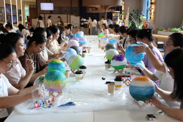“非遺糖畫”體驗(yàn)區(qū)宛如一個(gè)時(shí)光寶盒,帶領(lǐng)大家開(kāi)啟一場(chǎng)沉浸式傳統(tǒng)技藝之旅。糖畫藝人以勺為筆、以糖為墨,在光潔的石板上揮灑自如,一滴滴金黃色糖液瞬間變成栩栩如生、各式各樣的有趣圖案。活動(dòng)現(xiàn)場(chǎng),大家也紛紛拿起畫筆用色彩斑斕線條在月球燈上勾勒出星空浩瀚,每一筆都蘊(yùn)含著對(duì)中秋美好祝福和未來(lái)生活的向往。