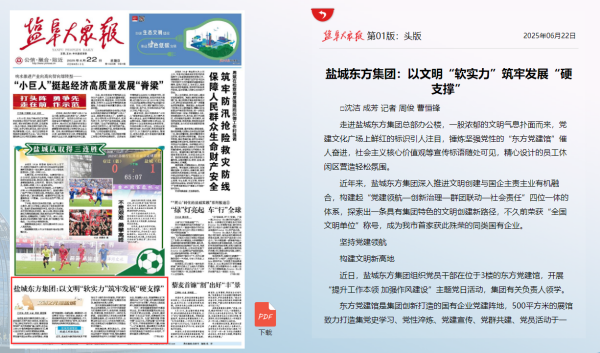 昨天,《鹽阜大眾報》在01版倒頭條發(fā)布《鹽城東方集團:以文明“軟實力”筑牢發(fā)展“硬支撐”》文章,濃情點贊鹽城東方集團喜獲“全國文明單位”殊榮。全文如下: