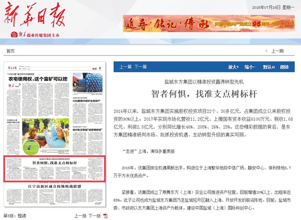 繼7月9日《鹽城東方集團15年如一日服務大局 奮發(fā)有為,共建共榮促發(fā)展》刊登后,7月16日,《新華日報》A5版,“交匯點”新聞客戶端,“新浪新聞”網(wǎng)站再次為鹽城東方集團打Call!http://xh.xhby.net/mp3/pc/c/201807/16/c506839.html(《新華日報》電子版)