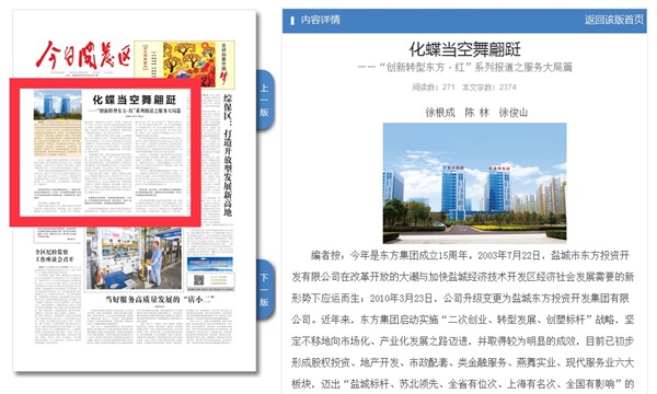 7月19日,為慶祝鹽城東方集團成立15周年,鹽城《今日開發(fā)區(qū)》報在頭版頭條重磅推出系列報道,記錄了東方集團轉(zhuǎn)型發(fā)展,改革創(chuàng)新的成長之路。