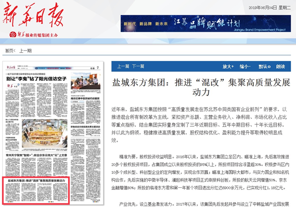 6月4日,《新華日?qǐng)?bào)》在A7版倒頭條位置,以《鹽城東方集團(tuán):推進(jìn)“混改”集聚高質(zhì)量發(fā)展動(dòng)力》為題,聚焦東方集團(tuán)混合所有制改革的做法,為東方集團(tuán)高質(zhì)量發(fā)展取得的豐碩成果點(diǎn)贊。