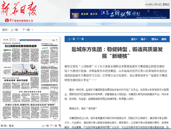 11月22日,《新華日?qǐng)?bào)》A7版倒頭條報(bào)道鹽城東方集團(tuán)高質(zhì)量發(fā)展的“硬核”舉措,濃情推介該集團(tuán)從單純政府投融資平臺(tái),向?qū)嶓w型、投資型、效益型、品牌型城投類(lèi)國(guó)企穩(wěn)健轉(zhuǎn)型取得的喜人成效。