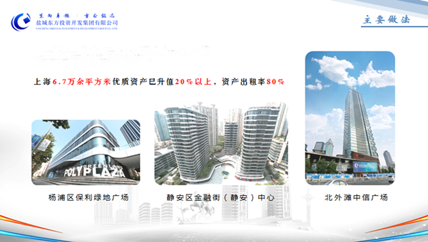2016年,處于轉(zhuǎn)型元年的鹽城東方集團(tuán),錨定上海內(nèi)環(huán)內(nèi)的高端寫(xiě)字樓,購(gòu)進(jìn)位于北外灘的中信廣場(chǎng)、金融街的靜安中心、保利綠地廣場(chǎng)3處共6.7萬(wàn)平方米優(yōu)質(zhì)資產(chǎn)。目前,這些資產(chǎn)穩(wěn)步增值20%以上、為資產(chǎn)證券化等金融創(chuàng)新提供重要保障,出租率76%以上,保證了穩(wěn)定收入和現(xiàn)金流。設(shè)立的燕舞東方實(shí)業(yè)(上海)公司,已成為靜安區(qū)億元骨干企業(yè),并承擔(dān)了為鹽城經(jīng)開(kāi)區(qū)招商引資搭建“橋頭堡”的重要任務(wù),其推進(jìn)的漕河涇公司以商引商招引包括世界500強(qiáng)企業(yè)——法國(guó)佛吉亞汽車(chē)部件項(xiàng)目在內(nèi)的電子商務(wù)、三創(chuàng)類(lèi)、高科技企業(yè)入駐,2018年落戶科技綠洲的16家企業(yè)實(shí)現(xiàn)銷(xiāo)售40億元、入庫(kù)稅收近3億元。