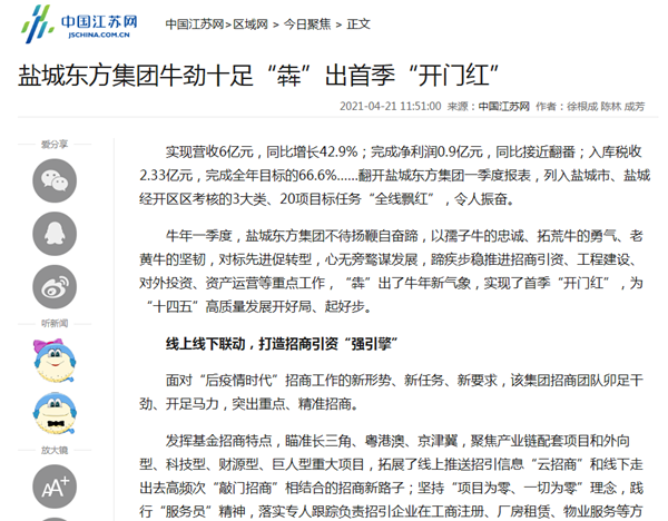 實(shí)現(xiàn)營(yíng)收6億元,同比增長(zhǎng)42.9%;完成凈利潤(rùn)0.9億元,同比接近翻番;入庫稅收2.33億元,完成全年目標(biāo)的66.6%……翻開鹽城東方集團(tuán)一季度報(bào)表,列入市、區(qū)考核的3大類、20項(xiàng)目標(biāo)任務(wù)“全線飄紅”,令人振奮。