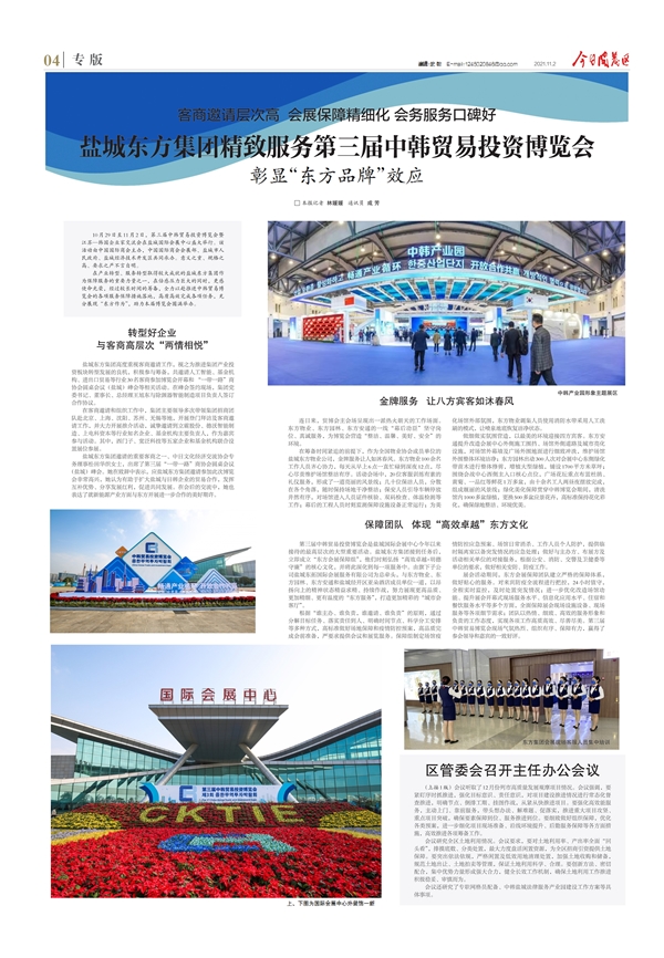 11月2日,今日開(kāi)發(fā)區(qū)報(bào)A4版以《鹽城東方集團(tuán)精致服務(wù)第三屆中韓貿(mào)易投資博覽會(huì) 彰顯“東方品牌”效應(yīng)》為題,整版報(bào)道了東方集團(tuán)高質(zhì)高效全力推進(jìn)服務(wù)保障中韓貿(mào)易博覽會(huì),展現(xiàn)“東方作為”的生動(dòng)寫(xiě)照。