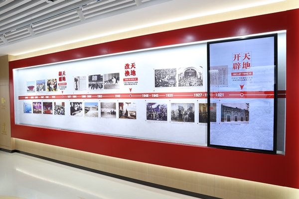 展陳方式守正創(chuàng)新。堅(jiān)持把時(shí)間與空間相結(jié)合、呈現(xiàn)與再現(xiàn)相結(jié)合、技術(shù)與藝術(shù)相結(jié)合的原則,保證展陳政治性、思想性、藝術(shù)性有機(jī)統(tǒng)一。在致力提升現(xiàn)有照片的清晰度、版面設(shè)計(jì)全力優(yōu)化、盡可能使用視頻便于及時(shí)動(dòng)態(tài)更新的基礎(chǔ)上,穿插使用了多種彰顯科技含量的現(xiàn)代展陳方式,包括用滑軌屏播放黨史素材、長(zhǎng)弧屏推介集團(tuán)發(fā)展大事記、L幕展示發(fā)展亮點(diǎn)、懸掛屏滾動(dòng)呈現(xiàn)先進(jìn)人物等。其中,在第一展廳中通過(guò)滑軌屏定時(shí)插放毛主席在開(kāi)國(guó)大典上講話情景再現(xiàn)的10分鐘視頻,讓受眾感到熱血沸騰、激情滿懷;L幕推送的《卓越東方·產(chǎn)業(yè)引擎》3D動(dòng)畫(huà)和發(fā)展情景的深度融合,讓人身臨其境、精神振奮。