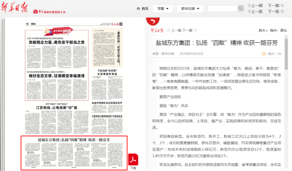 編者按:1月26日,新華日?qǐng)?bào)第16版“要聞”發(fā)布《鹽城東方集團(tuán):弘揚(yáng)“四敢”精神 收獲一路芬芳》文章,報(bào)道2023年度鹽城東方集團(tuán)取得的發(fā)展成果,生動(dòng)展現(xiàn)了集團(tuán)一路足音鏗鏘,以“四敢”精神,只爭(zhēng)朝夕、不負(fù)韶華,描繪高質(zhì)量發(fā)展的奮斗圖景。