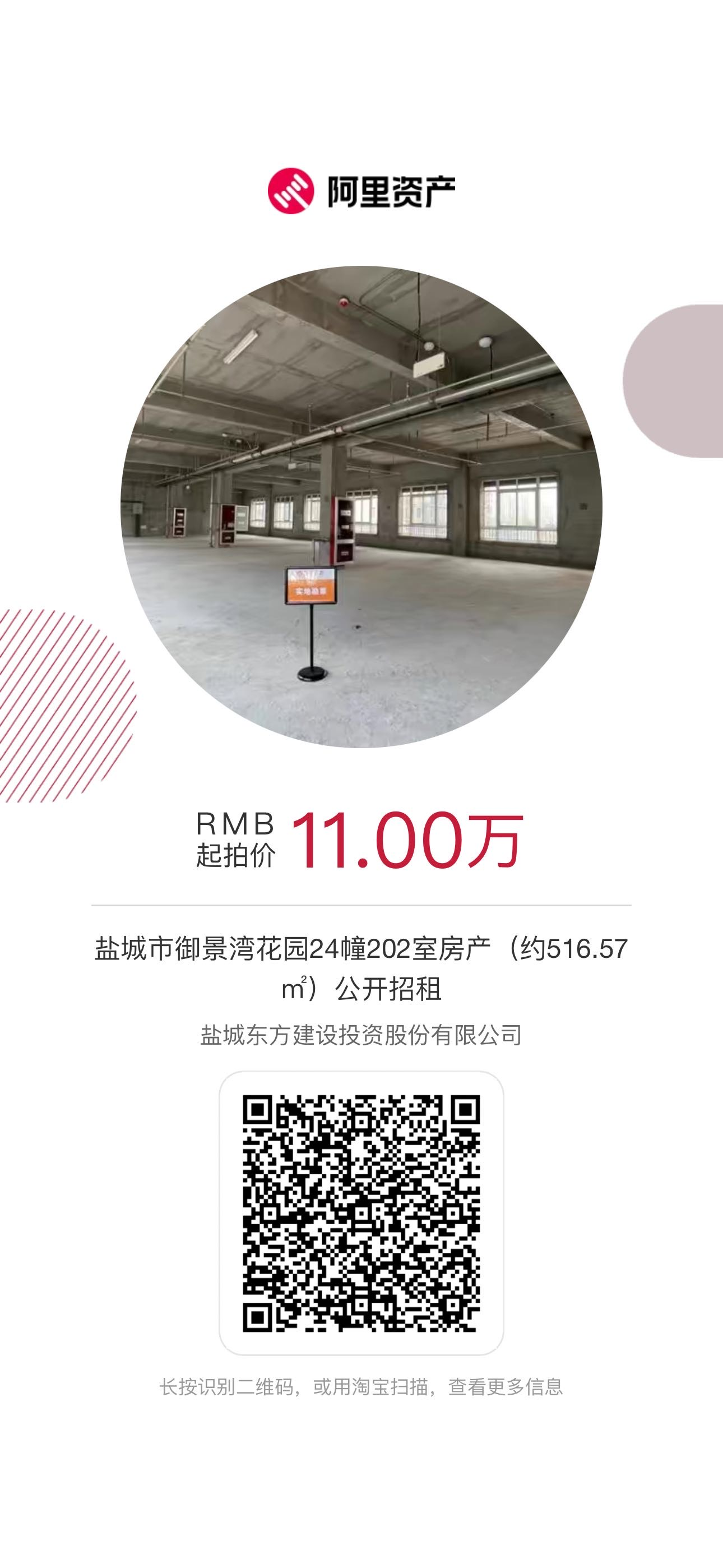 鹽城東方建設(shè)投資股份有限公司將于2024年4月24日10時(shí)起至2024年4月25日10時(shí)止(延時(shí)的除外),在阿里拍賣平臺(tái)對(duì)御景灣花園24#202室(商業(yè))進(jìn)行公開(kāi)招租,建筑面積516.57平方米,按現(xiàn)狀招租,免租期2個(gè)月,租賃底價(jià):110000元/年。加價(jià)幅度:2000元整或整倍數(shù),租賃期限為五年。