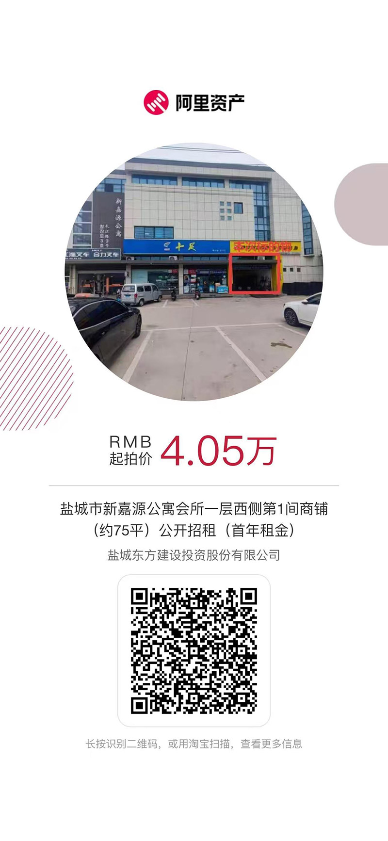 鹽城東嘉新建設(shè)發(fā)展有限公司將于2025年9月29日10時(shí)起至2025年9月30日10時(shí)止(延時(shí)的除外)在阿里平臺(tái)對(duì)鹽城經(jīng)濟(jì)技術(shù)開(kāi)發(fā)區(qū)長(zhǎng)江路3號(hào)新嘉源公寓會(huì)所一層西側(cè)第1間商鋪(約75平)進(jìn)行公開(kāi)招租,租賃起拍價(jià):40500元/年。加價(jià)幅度:500元整或整倍數(shù),租賃期限5年,免租期3個(gè)月。